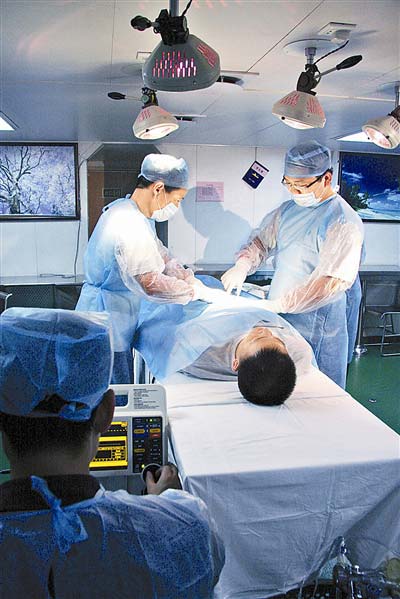 消毒、殺菌、安裝無(wú)影燈……不到30分鐘,南海艦隊(duì)“廣州”艦軍官餐廳就變成了寬敞、無(wú)菌的手術(shù)室,一場(chǎng)闌尾切除術(shù)演練正在這里緊張進(jìn)行。當(dāng)?shù)貢r(shí)間29日上午9時(shí),中國(guó)在執(zhí)行第4批護(hù)航任務(wù)途中,成功進(jìn)行了抵達(dá)亞丁灣、索馬里海域以來(lái)的首次海上模擬手術(shù)演練。(張旗 曹海華)