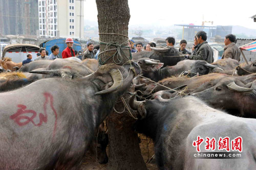 近中午時間,市場里買賣的人群還未散去。秦大章夫婦牽著剛買的;丶伊,這得花上2、3個小時的時間。回到家,喂牛的水又是一個問題,“沒干凈水夠它喝,只能像鄰居那樣把洗菜、洗臉腳的水留下給牛喝!鼻卮笳碌钠拮诱f。雖然羨慕村里有人可以用機器耕地,但家里的4、5畝地多在石頭叢生的半山腰上,秦家夫婦還是只能選擇最傳統(tǒng)的牛耕方式。