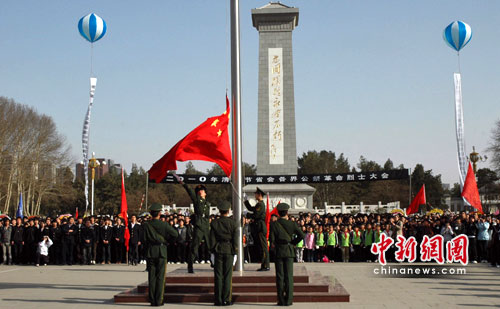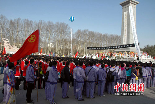 中新網(wǎng)石家莊4月2日電(牛琳 田國(guó)祥)2日,2010年清明節(jié)省會(huì)各界公祭革命烈士大會(huì)在華北軍區(qū)烈士陵園舉行。來自部隊(duì)、學(xué)校、醫(yī)院等各界人士約5萬(wàn)人參加了公祭儀式。