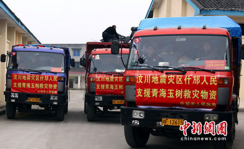 中新網(wǎng)什邡4月16日電(記者楊杰)16日上午,首批3輛滿載著代表“5.12”地震極重災(zāi)區(qū)什邡人民深情厚誼的捐贈(zèng)救災(zāi)物資車輛,從什邡市啟程,開始奔赴青海玉樹災(zāi)區(qū)。