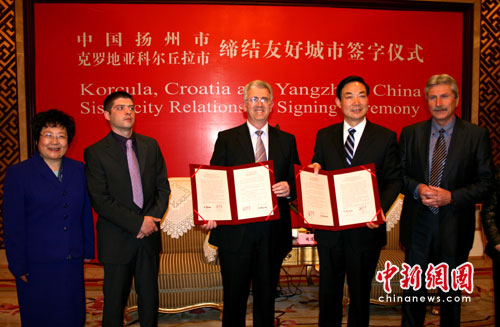 中新網(wǎng)揚州4月17日電(記者 崔佳明)16日,克羅地亞科爾丘拉市副市長弗蘭克•斯蒂奈克率團訪問揚州,當(dāng)晚,揚州市副市長聞道才和弗蘭克•斯蒂奈克副市長在揚州迎賓館分別代表兩市簽訂協(xié)議,雙方正式締結(jié)為友好城市。