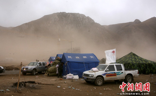 中新網(wǎng)青海玉樹4月19日電(記者劉忠俊)19日14:36分,青海玉樹地震災(zāi)區(qū)天氣突變,由晴天轉(zhuǎn)變?yōu)殛幪,現(xiàn)場掛起了大風(fēng),天空撒起了雨點(diǎn)。