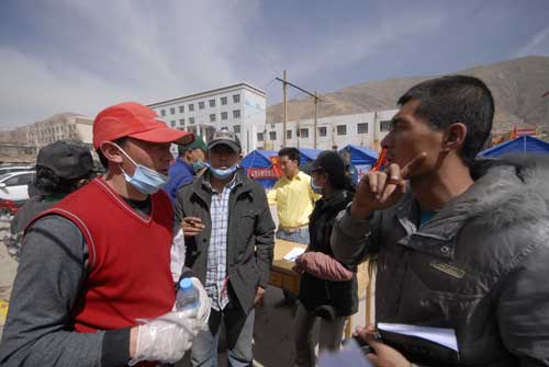 他的名字叫高樹(shù)友。在現(xiàn)場(chǎng)負(fù)責(zé)招募志愿者的玉樹(shù)團(tuán)州委干事扎西告訴我,地震發(fā)生后幾小時(shí),滿(mǎn)身是土的高樹(shù)友跑來(lái)了,找到我們要求當(dāng)志愿者!爱(dāng)時(shí)現(xiàn)場(chǎng)還很亂,我們隨便找了一張紙,高樹(shù)友寫(xiě)下了第一個(gè)名字”,扎西從桌上拿出一個(gè)寫(xiě)滿(mǎn)名字的紙說(shuō):“就是這樣的紙,現(xiàn)在已經(jīng)寫(xiě)滿(mǎn)幾十頁(yè),有400多人報(bào)名了,地震當(dāng)天有30多個(gè)。高樹(shù)友不僅是第一個(gè)報(bào)名,而且?guī)椭覀兘M織志愿者,這個(gè)招募點(diǎn)就是我們一起搭起來(lái)的!