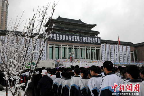 儀式在西寧最大的廣場新寧廣場舉行,在青海省博物館大樓上,高高懸掛著黑底白字橫幅“青海各族群眾深切哀悼玉樹遇難同胞”,橫幅下方的臺階上擺滿了花圈,一條條潔白的哈達懸掛在欄桿上。