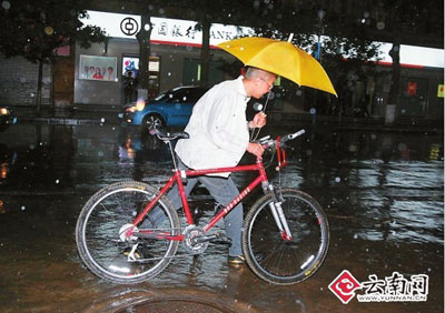 黑壓壓的烏云籠罩了昆明兩個小時之后,昨晚8點,一場從去年9月以來最大的降雨光臨昆明。當(dāng)豆大的雨點落在昆明家家戶戶的窗戶上時,市民都興奮了。大家的感覺沒有錯,昨天晚上的那場降雨確實是干旱以來的最大一場。雖然降雨只持續(xù)了約一個小時,但是電閃雷鳴間,這場雨已經(jīng)完全澆濕了昆明城。