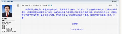 張春賢在帖中說:親愛的網友朋友們,根據黨中央的決定,我將離開為之奮斗、為之感動、為之自豪的三湘大地,心情久久難以平靜。我謹向親愛的湖南網友們告別,也真誠地感謝幾年來網友們對我各方面的支持。在與你們的互動中,使我快捷地了解了民情民意,集中了民眾智慧,更感受到網友們的家國情懷和良好素質。謹祝愿網友們幸福、快樂、安康!
