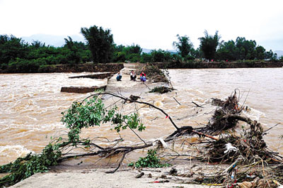 6日下午18時左右,位于乳源境內的國道323線K426+360處大型涵洞被洪水沖毀,造成路面出現(xiàn)一個14.5米深的大洞,被毀路基長90米、路面1000平方米、擋土墻2500立方米,致使交通完全中斷。公路部門已在現(xiàn)場設置了安全警示標志,并在可繞行路口設置指示標牌,安排人員疏導過往車輛改道行駛。搶險隊經(jīng)研究決定:先在該路段被沖毀的橋涵缺口旁埋設一條約2米長的涵管,并力爭用三天時間完成便道的鋪設工作,解決暫時的通車問題;待洪水過后,再在損毀路段新架一座橋梁徹底解決此處通車問題。