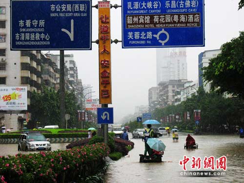 中新網(wǎng)韶關(guān)5月14日電(記者李凌)5月14日上午,一周前才遭受50年一遇洪災(zāi)肆虐的廣東韶關(guān)又遭暴雨襲擊,多個(gè)地點(diǎn)出現(xiàn)內(nèi)澇現(xiàn)象,特別是市區(qū)韶關(guān)大道、韶州賓館北出口,工業(yè)西大轉(zhuǎn)盤等7處水浸嚴(yán)重,導(dǎo)致交通中斷。