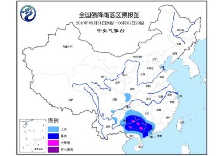 中新網(wǎng)5月31日電 中央氣象臺(tái)今日18時(shí)發(fā)布暴雨藍(lán)色預(yù)警:預(yù)計(jì)5月31日20時(shí)到6月1日20時(shí),貴州中東部和南部、湖南西南部、廣西中北部、廣東中西部等地有大到暴雨,其中貴州東南部、廣西中北部等地的局部地區(qū)有大暴雨;上述部分地區(qū)還將伴有短時(shí)雷雨大風(fēng)等強(qiáng)對(duì)流天氣。另外,四川盆地東北部、云南東北部等地的部分地區(qū)有大雨。