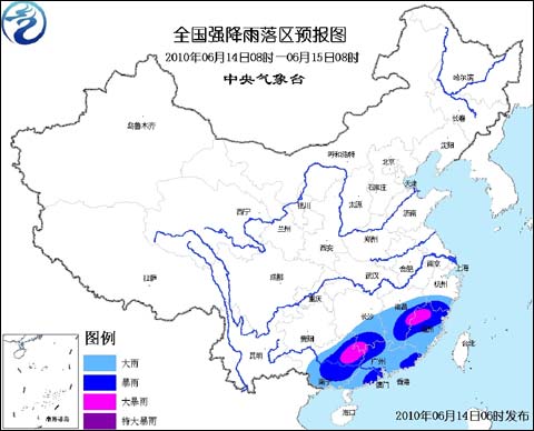 中央氣象臺6月14日06時繼續(xù)發(fā)布暴雨藍色預警: