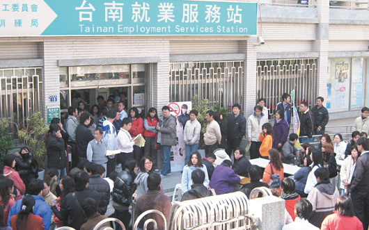 昨天各地就業(yè)服務(wù)站被擠爆,“勞委會”緊急將服務(wù)時間延長兩小時到晚上七點。據(jù)統(tǒng)計,十一個大型就業(yè)服務(wù)站一天內(nèi)涌進(jìn)一萬六千人,是去年春節(jié)后第一天一千五百人的十倍多,其中近八成、約一萬兩千八百人請領(lǐng)失業(yè)給付,激增三十倍,去年開春后第一天只有四百四十人。