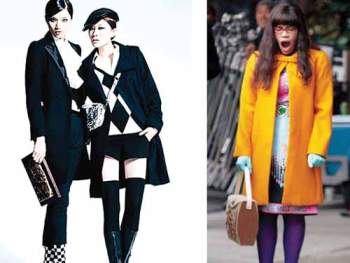 拋開(kāi)丑女貝蒂的身材不說(shuō),這件橙色大衣搭配紫色絲襪還是挺不錯(cuò)的,對(duì)比色運(yùn)用得很到位,圓頭淑女鞋搭配得也無(wú)懈可擊。