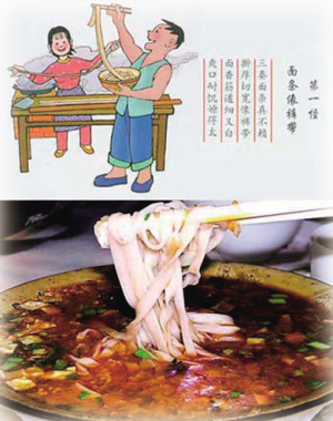 中國人吃面講究很多,實質(zhì)是把“人之常情”,“世間常理”物化在面條中。過生日吃長壽面;娶媳婦、喬遷新居要吃打鹵面,有湯有面有滋有味;農(nóng)歷二月二“龍?zhí)ь^”祈盼風調(diào)雨順吃龍須面。不同時節(jié),不同的喜慶節(jié)日吃不同的面條。