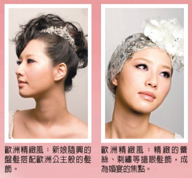 以往許多新娘發(fā)型都會(huì)使用鮮花,達(dá)人建議鮮花可以搭配緞帶和有垂墜效果的葉子,讓鮮花發(fā)飾更有時(shí)尚感,同時(shí)表現(xiàn)出新娘的神圣純潔;現(xiàn)在也有許多組合蕾絲或亮鉆的仿鮮花發(fā)飾,讓新娘造型有更多選擇。