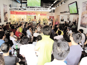 在南非世界杯舉辦期間,紐約華埠和小意大利區(qū)均沾著世界杯的喜氣,不少餐館、酒吧都在比賽時(shí)播放賽事,門外還有黑板寫上比賽兩隊(duì)介紹!跋愀壅尽笨觳偷晔侨A埠餐飲業(yè)首先這樣做的,餐館內(nèi)張貼了告示:“最低消費(fèi)4.25元,開(kāi)賽前30分鐘至散場(chǎng)!鼻蛎远颊f(shuō)值,因此每場(chǎng)賽事均座無(wú)虛席。11日荷蘭與西班牙爭(zhēng)桂冠,更加吸引球迷及準(zhǔn)球迷,餐廳內(nèi)爆滿,有的站在門外隔著玻璃看賽事,也感到過(guò)癮。
