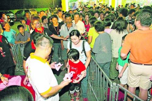 當(dāng)晚,檳州首長(zhǎng)林冠英偕夫人及孩子在7時(shí)35分抵步,在大山腳民眾陪同下,切下全馬最大月餅“月光寶盒”,原來(lái)月餅內(nèi)藏有一個(gè)寶盒寫(xiě)著“恭賀各界中秋節(jié)快樂(lè)”。