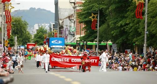 在醒目的“中華社區(qū)”英文橫幅后面,是幅面巨大的五星紅旗和新西蘭國(guó)旗。兩面旗幟都是3米寬5米長(zhǎng),合計(jì)面積達(dá)到30平方米,需要12個(gè)人共同擎舉,極為引人注目。華人隊(duì)伍聲勢(shì)浩大,鑼鼓喧天,紅旗招展,觀眾們看到隊(duì)伍過來,遠(yuǎn)遠(yuǎn)就開始熱情鼓掌歡迎,主持人還組織觀眾學(xué)著用中文齊聲高喊:“你好!”形成一股巨大的聲浪,向中華社區(qū)方陣致意,向基督城華人問好。