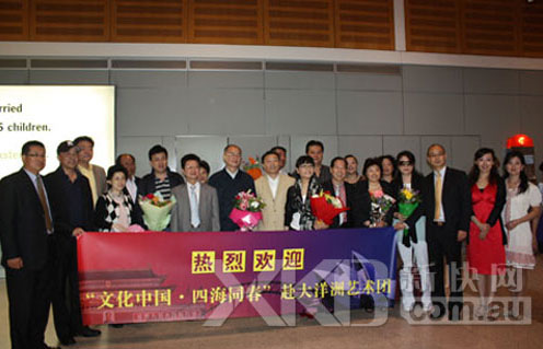 趙陽一行抵達(dá)悉尼后,受到胡山總領(lǐng)事等的熱情歡迎,悉尼藝術(shù)界、僑界代表拉起橫幅,送上鮮花,熱情歡迎到悉尼作慰問演出的藝術(shù)團(tuán)一行。