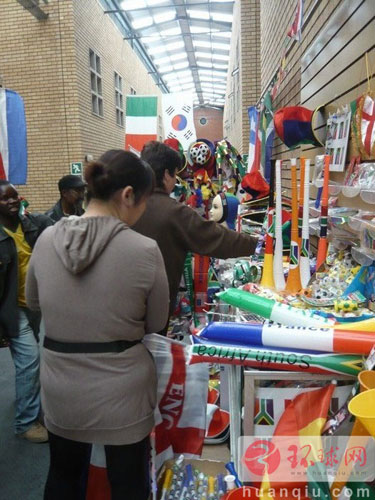 穿行在這里的商鋪之間,安全感和親切感倍增,到處是黃皮膚黑頭發(fā),還有不時會飄送過來的鄉(xiāng)音。商城中的狂歡氣氛相當(dāng)濃重,所有的走道里扎滿了世界杯32強的國旗。商鋪中最受歡迎的也是售賣世界杯相關(guān)商品的,每走幾步,就可以看到許多非華人的買家聚集在售賣球衣、球服、大喇叭的攤位前問價,而站在旁拍照的記者,竟因為長著華人的面孔,被屢屢誤認為是老板,遭問了不下十幾次“這個值多少錢?”實際上,世界杯官方的球衣和紀念品幾乎全都是中國制造的,當(dāng)然,百家商城里出售的商品多數(shù)是沒有授權(quán)的“山寨版”,比正版貨的價格便宜數(shù)倍,因此南非各地的人,也有不少專程跑到中國城來批發(fā)便宜貨?磥,世界杯又能讓南非華人大賺一筆了。(底婕)