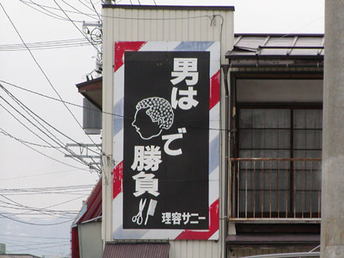 還有一回走過附近一家料理店,上面貼出的紙頭上寫的是“為了強(qiáng)化腸胃,去熱海集體宿營!” 比這個(gè)更絕的是鄉(xiāng)下的一家理發(fā)店,上面寫的是“男人憑腦袋瓜分勝負(fù)”,而這個(gè)腦袋瓜沒用漢字寫,生往上畫了一個(gè)卷毛兒的腦袋瓜,