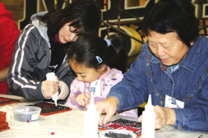 副會(huì)長鹿強(qiáng)當(dāng)天全家上陣,包括岳父岳母和妻子兒女在內(nèi)的一家六口全都來到了粘花現(xiàn)場(chǎng),一起為世博會(huì)花車中國館模型粘貼由紅豆和黑豆組成的吉祥圖案,岳父方先生一邊干活一邊表示,能為世博會(huì)花車出一份力,這是他們?nèi)业淖院馈?/p>