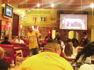 在華裔聚居區(qū)的清吧、飯店及西餐廳里,到處都聚集了湖人的球迷,他們說,買不起決賽的門票,聚在酒吧里,也可以增加一些看球的氣氛。他們一邊吃著烤雞、炸薯條,還可以喝一點啤酒,并高聲為自己喜歡的科比高喊“MVP”,“MVP”,很是來勁。