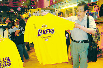 自夏威夷前往洛杉磯看望兒子的華先生和太太正在挑選湖人隊(duì)胸章,華先生表示,胸章較便宜,容易攜帶,盡量多買些送給夏威夷的鄰居朋友。而華太太則為兒子、孫女挑選湖人隊(duì)T恤衫、帽子。華先生說,估計(jì)花費(fèi)近200元購買各種湖人紀(jì)念品。