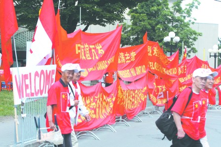 除了渥太華本地的華人團(tuán)體和學(xué)生外,多倫多大學(xué)中國(guó)學(xué)生學(xué)者聯(lián)誼會(huì)(UTCSSA),多倫多中國(guó)大學(xué)生聯(lián)合會(huì)(CUAUT)以及多倫多地區(qū)國(guó)家公派學(xué)生訪問(wèn)學(xué)者聯(lián)誼會(huì)等多個(gè)大多地區(qū)的學(xué)生團(tuán)體也組織了歡迎團(tuán),專程趕赴渥太華胡錦濤下榻的酒店舉行盛大的歡迎儀式。他們手持自備中國(guó)國(guó)旗和橫幅,在酒店前沿路排成一條秩序井然的歡迎隊(duì)伍。