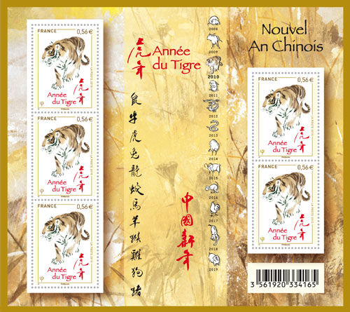 該“虎票”由旅法藝術(shù)家李中耀創(chuàng)作,這是他繼法國(guó)的“雞票”、“狗票”、“豬票”、“牛票”之后第5次獲得生肖郵票的創(chuàng)作權(quán)。