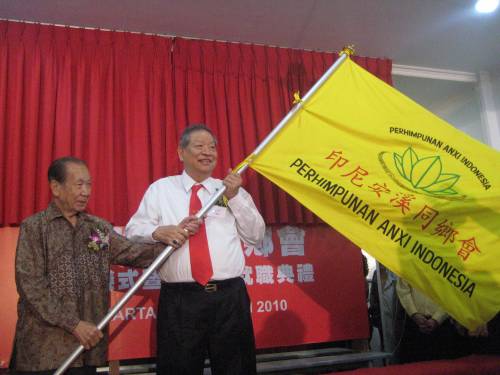 總主席白德明從資深榮譽主席唐裕手中接過會旗后表示,印尼安溪鄉(xiāng)親這些多年來夢寐以求的同鄉(xiāng)會,終于正式成立,舉行首屆的理監(jiān)事就職典禮。