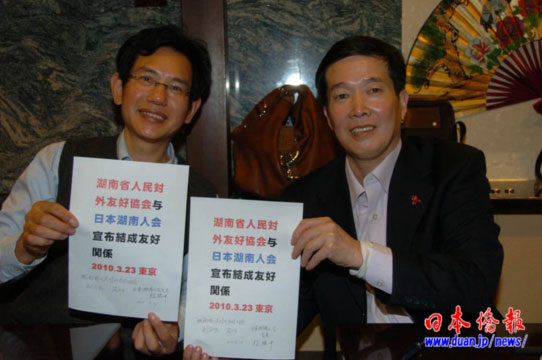 龐力平副會長及訪日團一行高度評價日本湖南人會的活動搞得好,為推動湖南與日本的交流做出了貢獻,勉勵該會繼續(xù)努力,爭取更大的成績向家鄉(xiāng)人民匯報。在龐力平副會長的提議下,日本湖南人會與湖南省人民對外友好協(xié)會當場簽署了結(jié)為友好關(guān)系的文件。