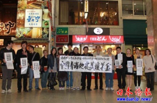 災情就是命令!災難無情,人間有愛!4月22日(星期四),愛媛松山一大早下起了多年未見的瓢潑大雨,但愛媛縣的同胞和日本友人仍然按照約定的時間,冒著大雨毅然走上街頭,開始了由聯(lián)合會帶頭部署倡導的聲勢浩大的街頭募捐活動。由三十多人組成的募捐隊伍,彼此不分中國人還是日本人,用真心與熱情共同譜寫、詮釋人間大愛——心向玉樹,情系災區(qū)!四幅由聯(lián)合會副會長、旅日山水畫家牛子華即時揮毫寫就的《愛媛縣華僑華人聯(lián)合會 中國留學生學友會 日中友好協(xié)會:為中國青海地震義援募金》的巨大橫幅在指定地點拉開了,募捐隊伍懷抱著十多個由聯(lián)合會事務(wù)局準備的專用募捐箱,拉開了活動的序幕!鞍萃袨橹袊嗪5卣馂膮^(qū)獻愛心”的募捐聲,聲聲入耳。向來對救災特別熱情的日本國民開始駐足慷慨解囊……和兩年前祖國汶川大地震賑災募捐情景同樣感人的一幕再次在同一地點重新演繹。我們禁不住熱淚盈眶——祈福災區(qū)人民!衷心感謝熱情、善良、友好的人們!第一天共募集到58,700日元。