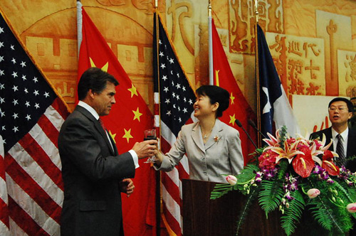 中新網(wǎng)4月28日電 據(jù)美國《美中信使報(bào)》報(bào)道,中國駐休斯頓總領(lǐng)事高燕平與美國德克薩斯州州長里克.佩里于當(dāng)?shù)貢r間27日下午5時在總領(lǐng)館會議大廳舉辦“慶祝上海世博會和中國-得州友好關(guān)系”招待會。擔(dān)任上海世博會形象大使的中國著名籃球明星姚明和他的妻子葉莉以及當(dāng)?shù)厝A人僑領(lǐng)及學(xué)界代表200余人應(yīng)邀出席招待會。