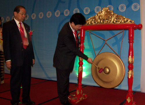 雅加達(dá)興安會館會長關(guān)文龍帶領(lǐng)中共莆田市委書記楊根生上臺為今次第五屆世界興安同鄉(xiāng)懇親大會暨第五屆世界莆商大會鳴鑼示意,宣布大會的正式開始。