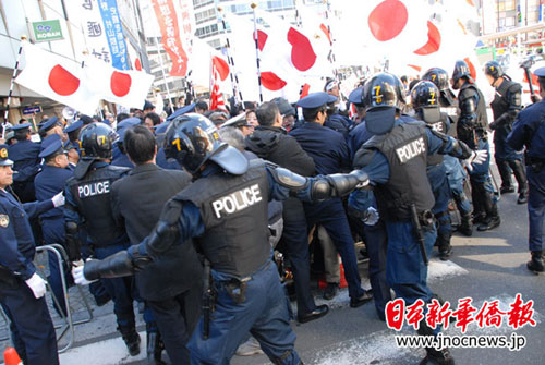 當他們在警崗前叫嚷結(jié)束后,準備前往“陽光城”物產(chǎn)店前騷擾搗亂。這個時候,警方機動隊一擁而上,將他們團團圍住,并且在四周設(shè)立了鐵欄障礙。他們發(fā)瘋般狂喊口號,做著“突圍”的動作。警方機動隊絲毫不為所動。一輛寫著“以恢復主權(quán)為目標之會”的面包車開了過來,跳下一個小頭目高喊:“我們?nèi)コ卮焓鹂棺h!我們申請后拿到了許可,為什么不允許我們?nèi)ィ俊比缓,他們分散陸續(xù)前往池袋警察署。