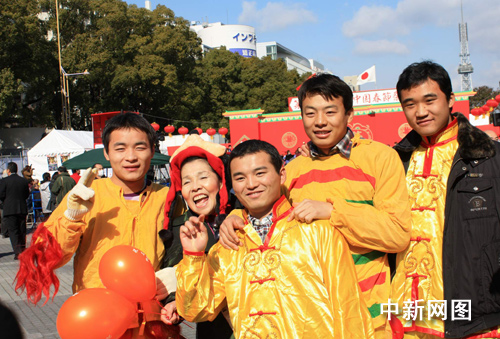 春節(jié)祭正面舞臺為名古屋市民獻上的是在日中部地區(qū)華僑華人團體、留學生、研修生以及日本當?shù)氐纳鐖F、學校選送的文藝節(jié)目。在主會場還有14家小吃店鋪以及41家物產(chǎn)、企業(yè)的宣傳攤位。值得一提的是,這中間不僅僅是華僑華人的店鋪,日本的大企業(yè)、日式旅店、電信公司、觀光宣傳部門都有參加。市民從四面八方源源不斷地被吸引過來,會場里面的人越聚越多。一邊品嘗美食一邊欣賞演出,有的市民還拉住表演完節(jié)目的身著鮮艷中國少數(shù)民族服裝、舞龍舞獅的中國留學生,熱情地與他們攀談、合影留念,讓記者無不感慨名古屋普通市民對中國文化的濃厚興趣和對中國人的友好情誼。