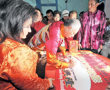 納吉在陳家民宅逗留了接近5分鐘后,馬上冒雨拜訪(fǎng)其余的3間民宅,并在第4戶(hù)人家王金發(fā)的住家,與王家、內(nèi)閣部長(zhǎng)等一同撈生。接著,首相則移師到陳亞珠路的中央大舞臺(tái)前,觀(guān)賞表演并進(jìn)行大型撈生。