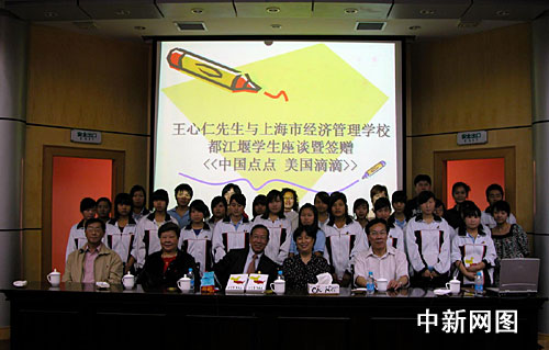 今天的贈(zèng)書儀式上,王心仁先生與大家分享了他的人生經(jīng)驗(yàn)。當(dāng)了解到去年汶川大地震后上海市經(jīng)濟(jì)管理學(xué)校接收了近70名來自上海對口支援地區(qū)四川都江堰的學(xué)生時(shí),王心仁先生勉勵(lì)這些遠(yuǎn)離家鄉(xiāng)的同學(xué)能夠珍惜學(xué)習(xí)機(jī)會,并向這些學(xué)生每人送上了一張上海交通卡,希望他們多多了解這個(gè)城市。