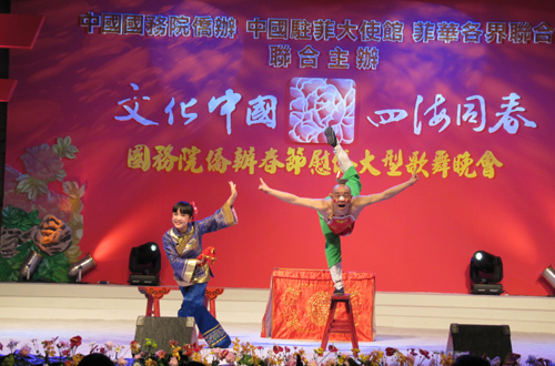 這是國(guó)務(wù)院僑辦和中國(guó)海外交流協(xié)會(huì)“文化中國(guó)·四海同春”2010年春節(jié)赴菲律賓藝術(shù)小組在演出,只見臺(tái)下掌聲不斷,臺(tái)上精彩紛呈:《滾燈》語言詼諧,情節(jié)幽默,將川北燈戲的民間生活情趣描繪得淋漓盡致!蹲兡槨肥谴▌≈猩衿婷利惖慕^技,大木偶變臉更是精彩絕倫,令人嘆為觀止。