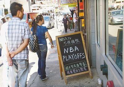 紐約曼哈頓華埠及附近小意大利區(qū)的餐飲業(yè)者也以觀賞體育比賽為噱頭吸引球迷用餐。在華埠有數(shù)間店的“香港站”中餐廳,近日就在地威臣街店面門前擺放醒目的雙面告示板。一面寫著以超大型高清屏幕和現(xiàn)場環(huán)繞立體聲不停播放NBA季后賽,另一面寫著從6月11日起至7月11日直播南非世界杯每場賽事。