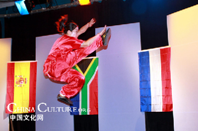 中國文化中心武術(shù)隊(duì)表演了南拳、長拳和三節(jié)棍等項(xiàng)目。他們在鏡頭前全神貫注、一絲不茍,最大程度地把自己所學(xué)完美地呈現(xiàn)給電視機(jī)前的觀眾。南拳套路短小精悍,結(jié)構(gòu)緊湊,手法多變,步法穩(wěn)健,并以聲助威,威猛迅疾,靈巧綿密,上肢及手型尤其富于變化;長拳套路姿勢舒展大方,動作靈活快速,剛?cè)岵?jì),快慢相間,動靜結(jié)合,節(jié)奏分明,并帶有跳躍、跌撲和滾翻動作,非常精彩;而三節(jié)棍則是伸縮自如,三節(jié)相互轉(zhuǎn)換,方法多變,遠(yuǎn)近兼顧,動作兇猛敏捷,氣勢逼人。棍法有劈、掃、掄、擊、戳、絞、格以及各種舞花,變幻無窮,令人驚嘆。這三個項(xiàng)目是文化中心的保留節(jié)目,深受武術(shù)學(xué)員們的喜愛。