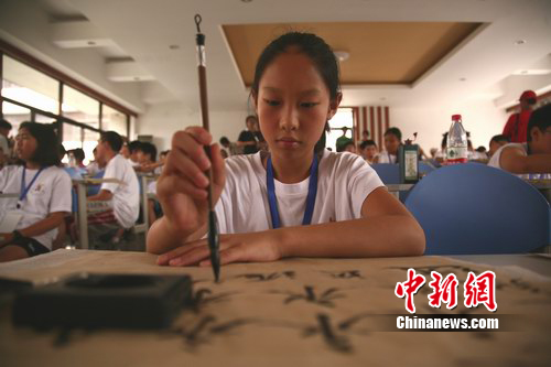 中新網(wǎng)成都7月30日電 (徐楊祎 張浪)30日上午,170多位參加“2010中國尋根之旅”夏令營四川營的海外華裔少年,來到位于四川大學(xué)的書法教室,學(xué)習(xí)中國書法。