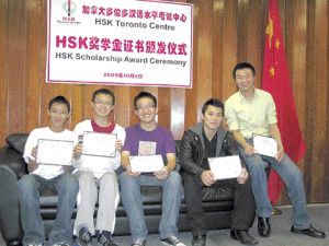 郭凌清、李賦涵、張庭、黃帝鈞、張龍江五位同學,都在去年參加由加拿大多倫多漢語水平考試中心主辦的中國國家漢語水平考試,并取得優(yōu)異成績。4日他們在親友和家長的陪同下,領取國家漢辦孔子學院獎學金證書,并暢談暑期前往中國學習漢語的美妙經(jīng)歷。