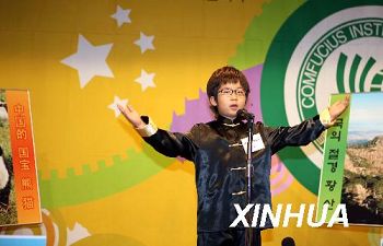 10月10日,在韓國首都首爾舉行的第二屆小學(xué)生漢語演講比賽上,樸焌汎小朋友在講述自己對(duì)中國美麗風(fēng)景和大熊貓的向往。當(dāng)日,由韓國現(xiàn)代中國研究會(huì)和韓國HSK實(shí)施委員會(huì)主辦、首爾孔子學(xué)院主管的第二屆小學(xué)生漢語演講比賽在首爾舉行。來自韓國各地的30多名小學(xué)生經(jīng)過激烈的角逐進(jìn)入決賽。(新華社/何璐璐 攝)