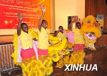 10月12日,在肯尼亞首都內(nèi)羅畢,4名內(nèi)羅畢大學(xué)孔子學(xué)院的學(xué)生在聯(lián)歡會(huì)上表演中國(guó)舞獅。當(dāng)天,200多名來自北京理工大學(xué)、內(nèi)羅畢大學(xué)孔子學(xué)院和津巴布韋大學(xué)孔子學(xué)院的大學(xué)生們?cè)趦?nèi)羅畢大學(xué)舉行聯(lián)歡會(huì),同學(xué)們以合唱、舞蹈等精彩的節(jié)目交流情感傳遞友誼。(新華社/徐速繪 攝)