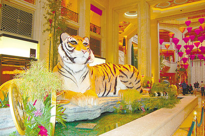 百麗宮賭場(chǎng)大廳瀑布前,以金毛虎為主題,標(biāo)示中國(guó)虎年的意義,圍繞這支巨虎有太湖石以及中國(guó)孔方銅錢,瀑布旁以竹林、紅橋和金橘樹點(diǎn)綴,樹枝上還掛滿寫上“吉祥如意”的紅封套。