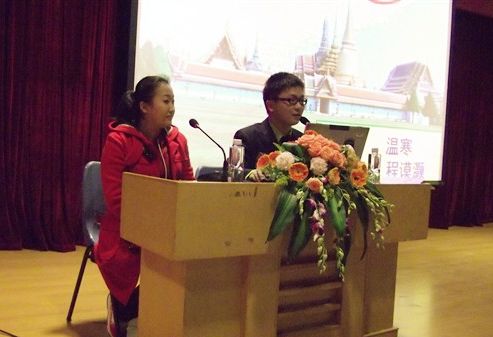 程謨?yōu)瓰槿A僑大學(xué)華文學(xué)院2009屆對外漢語專業(yè)畢業(yè)生,溫寒為文學(xué)院2009屆廣電專業(yè)畢業(yè)生,兩人于2009年被派往泰國擔(dān)任漢語教師志愿者。(王若凡 文/圖)
