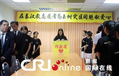 當(dāng)天下午,國(guó)家漢辦駐泰國(guó)代表處會(huì)議室氣氛莊嚴(yán)肅穆。大家一同觀看了志愿者自己制作的視頻《我們?cè)谝黄,永遠(yuǎn)不放棄》。隨后,全體人員為青海玉樹(shù)震災(zāi)中的遇難者默哀三分鐘,大家神情凝重,淚光閃閃。志愿者代表們?cè)诂F(xiàn)場(chǎng)還紛紛解囊為災(zāi)區(qū)同胞捐款。