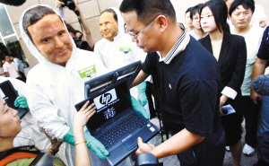 昨天(25日),三位國(guó)際環(huán)保組織綠色和平的志愿者出現(xiàn)在惠普中國(guó)總部門前,每人手捧一部帶有“毒”字樣的惠普筆記本電腦。綠色環(huán)保一位負(fù)責(zé)人表示,由于惠普推遲其承諾的在產(chǎn)品中消除兩種有毒物質(zhì)的時(shí)間,因此用這種方式勸惠普“戒毒”。
