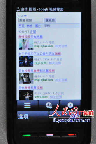 在搜索視頻內(nèi)容時(shí),輸入“激情 視頻”后,手機(jī)立刻顯示出許多帶有不堪入目圖片的鏈接,其中第一個(gè)便是名為“美女視頻美女艷舞”,谷歌在這次打擊手機(jī)色情行動(dòng)中的反應(yīng)可見一斑。